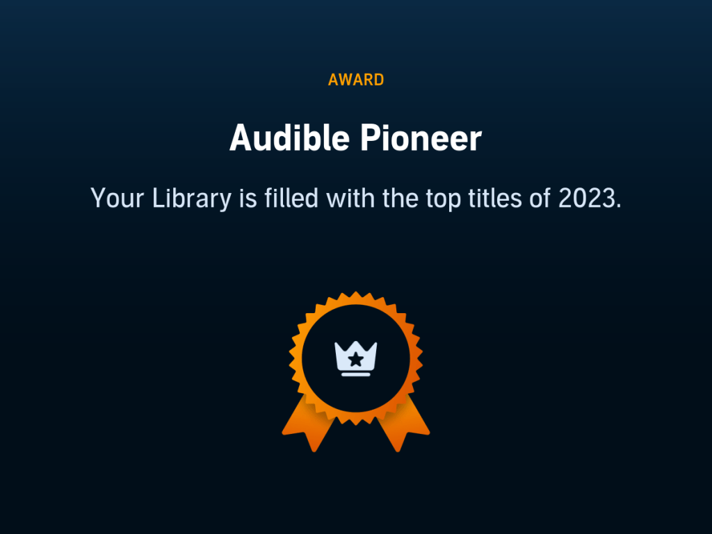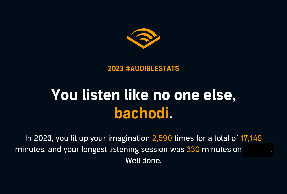 Audible bach Books, Education, Politics, Religion, Society January 12, 2024 1 Minute A quick feels_good_on_achievement post on all the good things Audible emailed me on. Rate this:Share this: Click to share on WhatsApp (Opens in new window) WhatsApp Click to share on Facebook (Opens in new window) Facebook Click to share on X (Opens in new window) X Click to share on LinkedIn (Opens in new window) LinkedIn Click to share on Reddit (Opens in new window) Reddit More Click to share on Pinterest (Opens in new window) Pinterest Click to print (Opens in new window) Print Click to email a link to a friend (Opens in new window) Email Click to share on Pocket (Opens in new window) Pocket Click to share on Tumblr (Opens in new window) Tumblr Like Loading... Related Published January 12, 2024